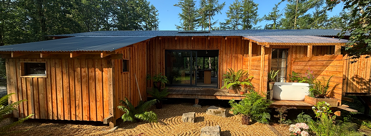 The owners, Marcus and Abi, situated sustainability as the centre of the Big Wood Cabin, with their new home challenging the fast-paced city lifestyle by prioritising eco-friendly practices and materials.