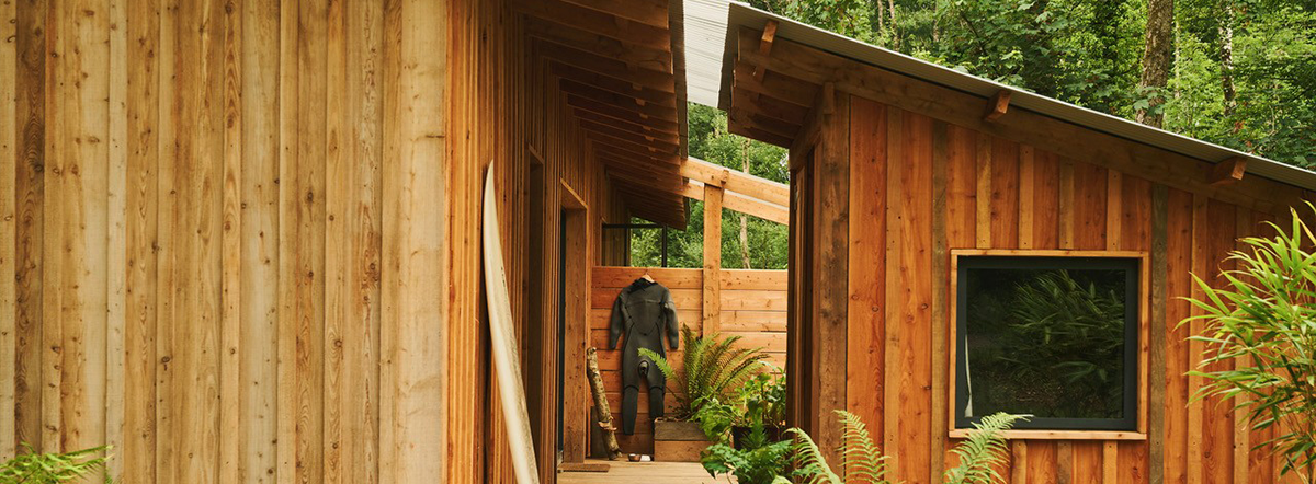 An overhang has been implemented on the perimeter of the building to shield the exterior during the wetter months, helping to prolong the lifespan of the materials. This use of the roofing sheets is a great way to promote water runoff and prevent water from entering through the edges of the system. Overall, this creates a durable design that reinforces sustainable values.