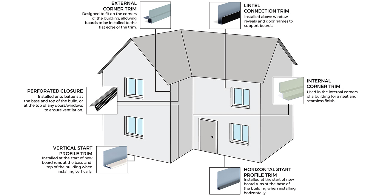 Aluminium start profile trims provide fibre cement cladding boards with a strong, level base for a professional finish. Wall cladding boards can be installed onto these start trims once in place and will make sure your project remains level as you go. Ensure all trims and perforated closures have been installed ahead of any fibre cement wall cladding boards.