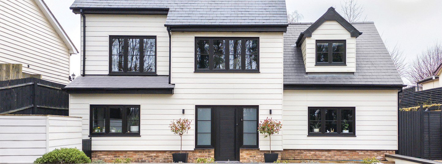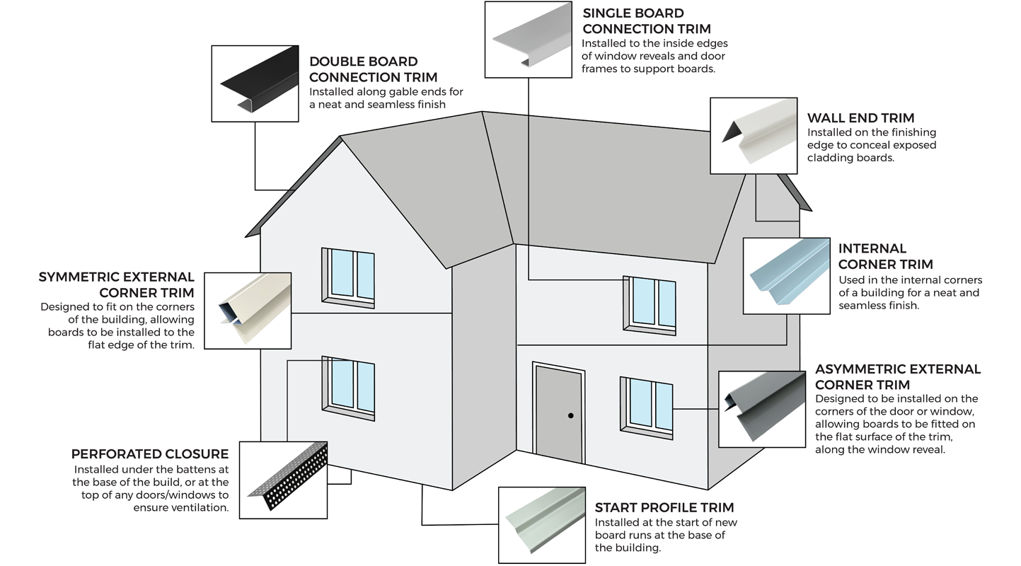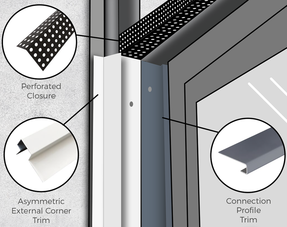 Before the wall cladding can be installed around any windows or doors, asymmetric external corner trims must be fixed to the battens, fitted using 39mm fibre cement screws with colour-matching heads at regular intervals. If your doors, windows or walls require bespoke trims, these are fitted here instead of the asymmetric external corner trims.