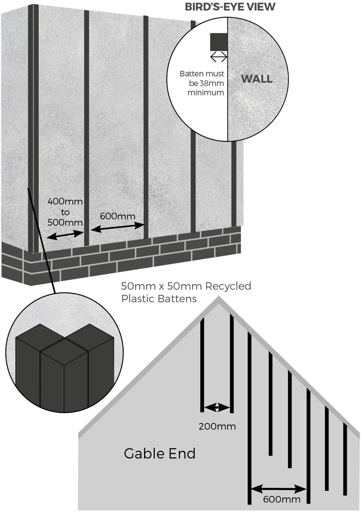 Battens must be no more than 600mm apart, reducing to 400mm or 500mm at boundary areas, and a clear space of 38mm should be left at the base of the battens.