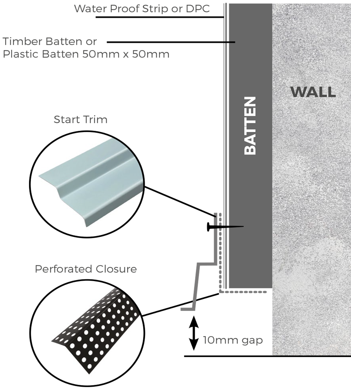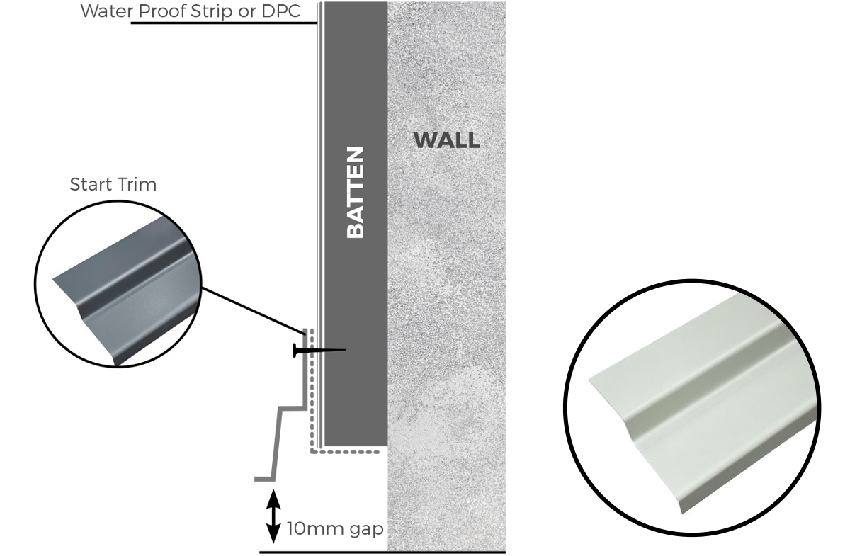 Ensure the lip of the start trim is just below the base of the batten. Make sure there is a 10mm clearance between the base of the trim and the base of the wall.