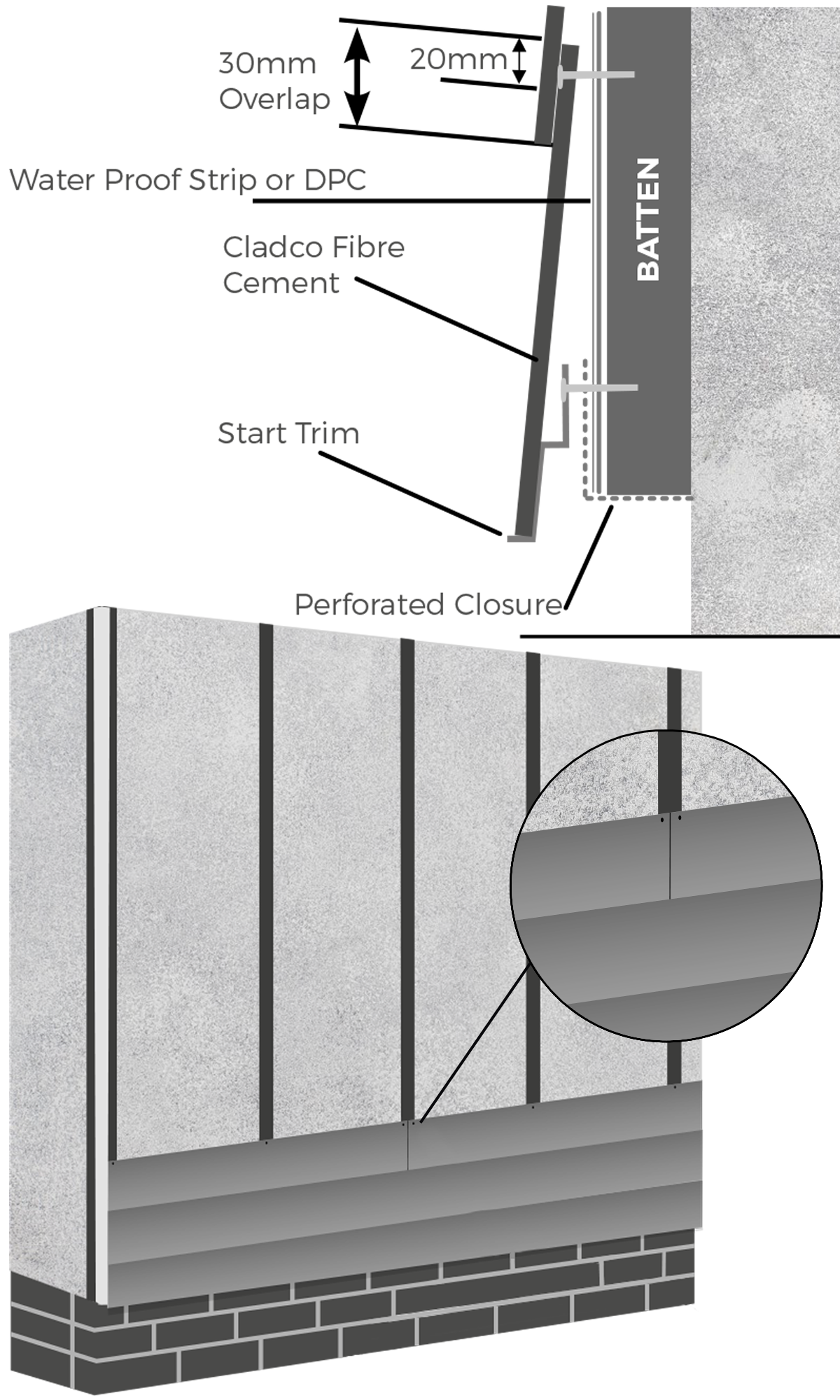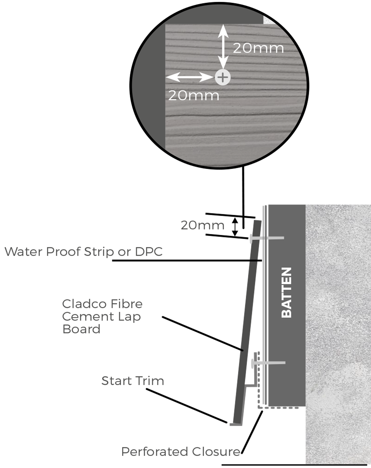 Please note: the damp proof course must be installed on any battens around corners, or on any double battens (where two cladding boards are butted together).