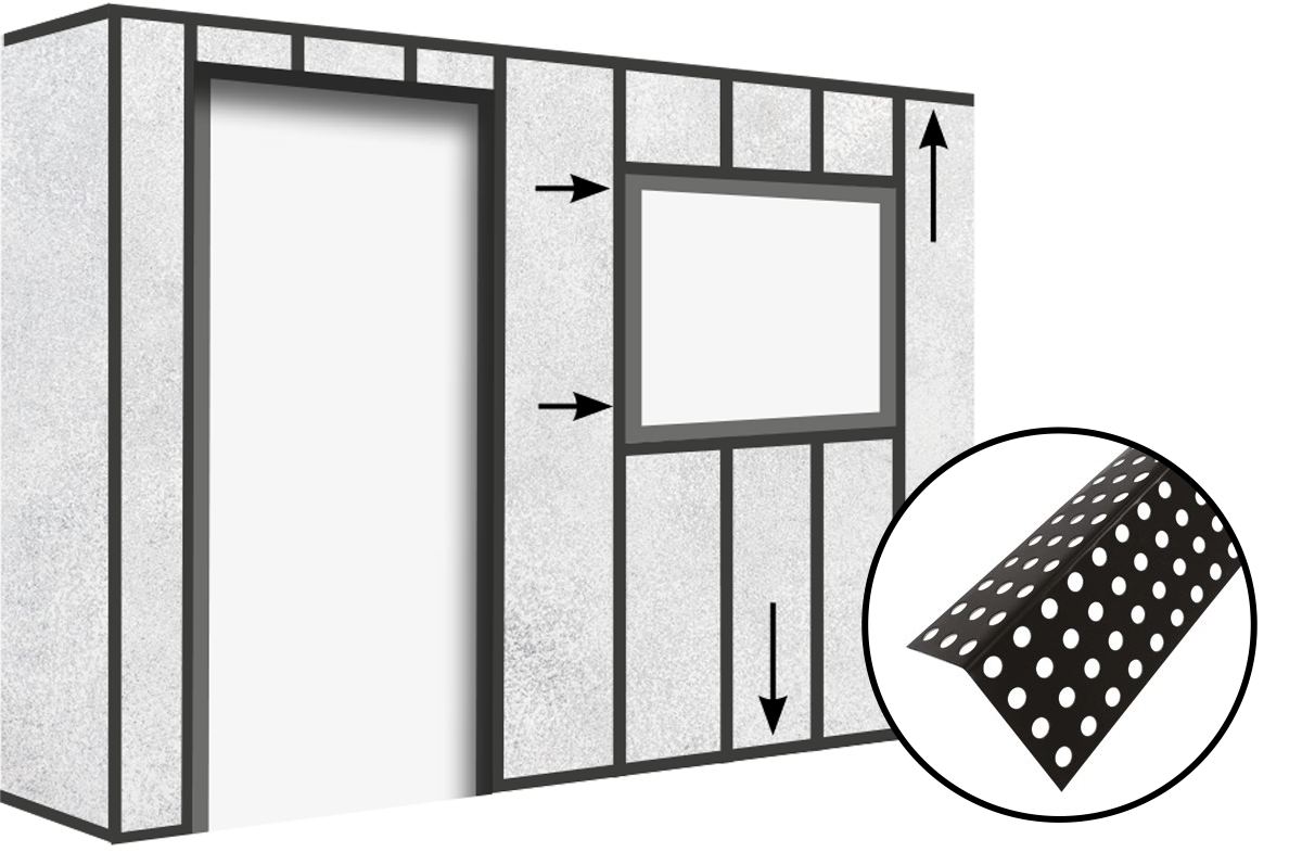 Alongside the asymmetric external corner trims previously installed around windows and doors, secure connection profile trims to the internal corners of a window or door reveal using 39mm screws, as shown in the diagram. Make sure that the small painted edge of the connection profile trim sits neatly against the window or door frame.