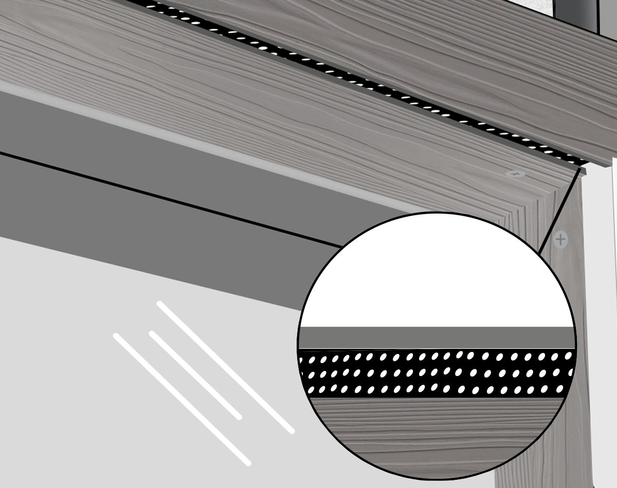 Perforated closures must be installed before the trims. Start by measuring the width of the top and bottom of the walls and windows, as well as the width of any doors. Cut the perforated closure to the correct lengths using Cladco straight cut tin snips. Using 39mm fibre cement screws with colour-matching heads, fix the perforated closure onto the battens along the top and bottom of the walls, windows and the top edge of any door frames.
