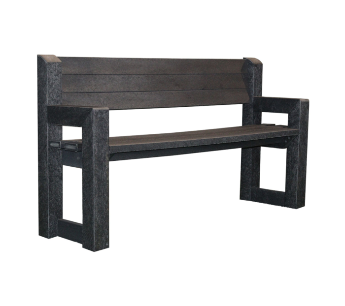 A modern take on the classic bench, this recycled plastic bench with arms is made in North Wales from 100% recycled plastic. Weatherproof, vandal-resistant and maintenance-free, it offers long-lasting seating for gardens, holiday parks, town centres and more, with an estimated 120-year lifespan and zero ongoing upkeep.