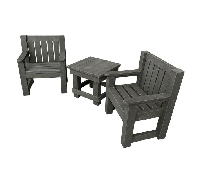 Made in Wales from 100% recycled plastic, this recycled plastic table and chairs set includes two vertical-backed chairs and a garden coffee table, ideal for patios, cafés, pubs and sporting venues. It’s vandal-resistant, weatherproof and maintenance-free, with a 120-year lifespan for long-lasting, cost-effective outdoor seating.